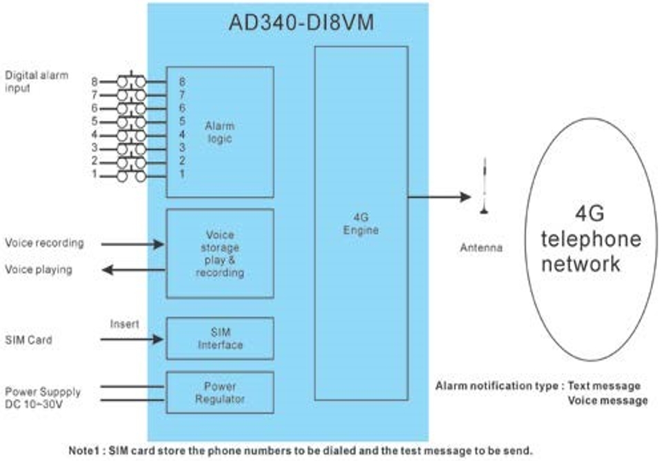 AD340-DI8VM extends the functionality of AD340-DI8 by adding voice message notification. AD340-DI8VM provides 8 digital alarm inputs to detect multiple alarm conditions. Different text or pre-recorded voice messages can be defined for each input. When an alarm signal is detected on one of its input, the corresponding text or voice message will be sent to designated users. Alarm reset messages can also be defined and sent to indicate that alarm conditions have been cleared.