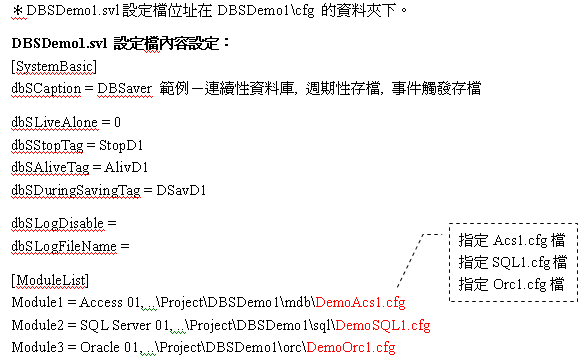 另外必須再建立一個基本設定檔.SVL與三個模組設定檔.CFG。此基本設定檔最多可設定16組.CFG模組設定檔,即可同時在圖控畫面上設定16種不同的資料庫來儲存資料。基本設定檔.svl與模組設定檔.cfg如何設定,詳細請參閱「DBSaver 資料庫存檔工具程式」手冊。
