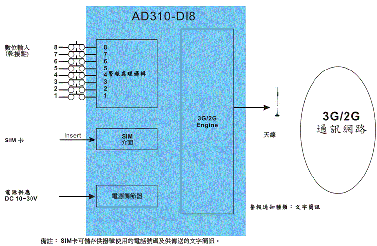 2G/3G Alarm Caller-AD310-DI8 数位输入*8 【文字简讯通报】