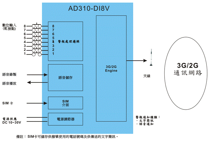 2G/3G Alarm Caller-AD310-DI8V 数位输入*8 【文字简讯/语音通报】